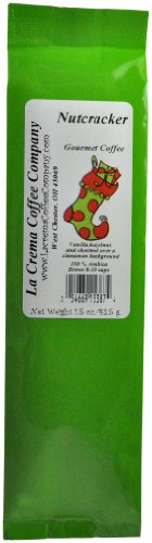 La Crema Coffee Stocking, Nutcracker, comes in 1.5 ounce package. Vanilla, hazelnut, and chestnut over a cinnamon background. We start with freshly roasted-to-order 100 percent Arabica beans and finish all of our gift items with hand-tied bows.