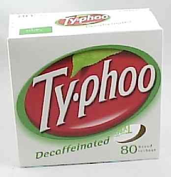 Typhoo Decaf Tea 80 bags. Typhoo Decaf Tea is now available in a resealable foil bag to improve freshness. Typhoo Decaf tea give a rich full bodied brew with a distinct gold color. Typhoo decaf is Britain's most popular decaf tea.