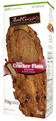 0g Trans fat. Whole grains. Naturally delicious. Fresh baked & full of crunch. Made with fresh onions & sesame seeds. Aunt Gussie's Spelt Cracker Flats are more that just a nutrious product. It is the perfect choice for people who want to eat tasty whole grain products. Spelt is an ancient grain with a rich nutlike flavor that contains special carbohydrates which stimulate the body's immune system. It is also a superb source of fiber, B-Complex Vitamin and has more protein than wheat. YouÆll also enjoy our Cracker Flats snapped into pieces with your favorite dip or salsa! Aunt Gussie's bakes for your family using home recipes & premium - quality ingredients. Over the past 25 years, these healthy, old-fashioned cookies and baked goods have grown from a home kitchen business into a nationwide sensation! Today's health-minded consumers simply can't get enough of Aunt Gussie's wholesome Cookies, Biscotti and Cracker Flats. All are baked with healthy, natural, top-quality ingredients such as organic wheat, spelt and whole wheat flours. Made in the USA.
