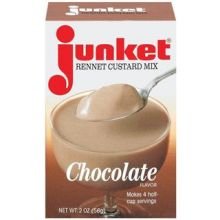 Junket custard mix is a popular nostalgic dessert. No eggs, no cooking, no problem. The rennet enzyme is the very substance that nature provides for more perfect digestion of milk. Easily made in a minute, sets in ten minutes. Chocolate flavored. Each box makes 4 1/2 cup servings. It contains sugar, cocoa (soy lecithin), nonfat dry milk, gelatin, calcium gluconate, rennet powder, lactose.